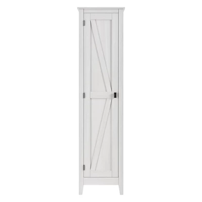 The Room & Joy Brookside 18” Wide Storage Cabinet is a stylish way to stay on top of your organization. The rustic barn style design and sleek tapered feet gives the look of an old weathered cabinet but the sturdy laminated particleboard and MDF make this cabinet the perfect piece to house your home office supplies, extra linens, seasonal clothing, nonperishable food and more! Open up the door to 4 spacious shelves, 2 adjustable, to fit items of differing sizes. The door can be assembled on either the left or right side so you can arrange your room however you need. The Brookside Cabinet is recommended to be assembled and moved by 2 adults. A wall anchor kit is provided for extra safety and security. After assembled, this cabinet measures to be 71.89”H x 18.19”W x 15.67”D.