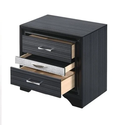 The Naima nightstand offers a sophisticated look, clean lines and contemporary style. This black nightstand features three drawers, with the middle drawer being a Felt-Lined jewelry drawer with compartments and front panel with crystal like inserts. Add this nightstand to your bedroom to provide an elegant style that will bring you a perfect sleek design. Complemented by wooden legs, this nightstand features contemporary feel and a glossy black finish throughout the collection.
