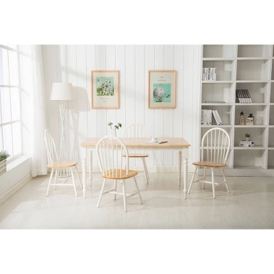 The Farmhouse 5-Piece Dining Set’s good looks and reliable versatility are an investment that’s sure to pay off over and over again. This five-piece set includes a dining table and enough seating for four guests. The chairs have Windsor-style spindle backs while table’s turned legs are sure to draw attention in the very best way. All the pieces are made from solid hardwood with a two-tone finish that makes us love it even more: crisp white paired with glossy natural wood is a dream combination! The dining set’s Farmhouse style makes this a cozy place to gather around for holiday dinners, casual morning meals, and game nights with friends. For extra seating, consider adding on the matching Farmhouse Bench (sold separately).