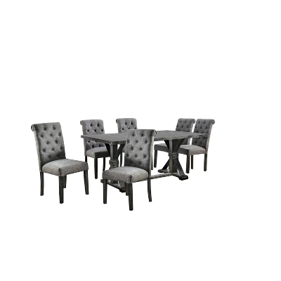 The double pedestals of this six piece dining set feature striking trestle style bases with diagonal riveted metal supports for an Industrial design style. The rectangular table offers a spacious tabletop for entertaining with its six comfortable side chairs. Offering a Rustic vibe, this inviting set features an antique black finish with light distressing that lends a vintage feel to the dining set. Chairs boast rolled backs and all seating features linen-look fabric upholstery and button tufting.