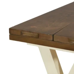 This cozy farmhouse style flip top table offers the flexibility of a casual dining table as well as a rustic table doubling as a work desk. Ideal for small spaces, the flip top opens up to reveal additional table top surface area for dining with friends or close top for a versatile console or entry table. Classic, cross beam legs provide style and pull out wood supports offer strength and stability to the flip top leaves. Our distressed chatter finish adds a homey warmth to every home. Get the farmhouse style you crave with the Albury flip top table.