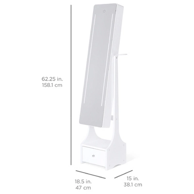 Get ready in style and keep accessories organized in one LED full-length mirror! Keep your favorite jewelry inside this elegant interior and have a place for beauty tools with a hairdryer holder, ring slots, necklace hooks, fold-out shelf, brush holders, and large bottom drawer. Enjoy a high-quality, elegant design made with engineered wood, velvet lining, and even a magnetic soft-close door. No more guessing if your shoes match – tip the mirror to find the perfect angle and make sure you look perfect from head to toe!