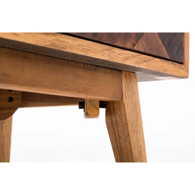 The Benton Dresser from Burnham Home brings your bedroom mid-century design reimagined for the modern age. Its oak wood body uses a mix of dark and natural stains, creating a rich array of tones. The inlaid chevron pattern on the front is eye-catching. Four angled legs flare outward for an additional mid-mod touch. Six drawers provide plenty of room for storing all your sweaters, trousers, t-shirts, and other clothing. Or get creative and use this piece as a credenza in a dining room instead. However you use it, be sure to pair it with the matching Benton Nightstand!