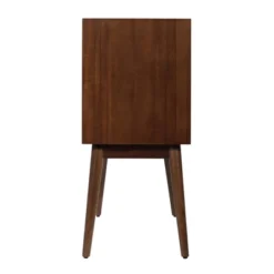 Bring a touch of midcentury modern style to any small space with a two-door storage cabinet. Designed with tapered legs and a low profile, this cabinet is made of walnut-stained wood veneer and features stylish doors and two shelves for plenty of storage space. The roomy interior and large top allow you to use the wooden storage cabinet in a variety of different ways and in virtually any room in the house. Use it as an entry table by the front door, a sideboard in the dining room, or as a mid century bar cabinet.