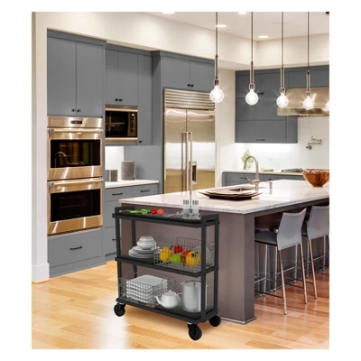 The Transformable 3-Tier Cart System provides efficient mobile storage for use in the kitchen, office or garage. Whether you are entertaining or just need extra storage, you can interchange shelves and baskets to suit your needs. The high quality, powder-coated steel frame is built for years of use. Four casters (two locking) allow for effortless movement. Contains 4 interchangeable premium laminated shelves and 2 sturdy wire baskets with liners. Each shelf allows for 12″ height and a weight capacity of 33 pounds per shelf.