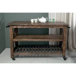 You will enjoy entertaining your friends and family and the ease in which you can do so with this amazing castored cart. Finished all the way around in our natural Celebrity Distressed Brown with chatter mark detailing, this cart features two full lower shelves – one of which is slatted, and both of which are perfect for holding baskets and bottles and platters. With towel racks on either end and a spacious upper surface for prepping and serving, just roll this super Cart to wherever you want the party to happen.