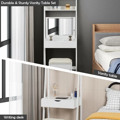 This is our high quality vanity table set with large capacity and multiple functions. It is made of high quality P2 MDF to improve the durability and give you an extremely long service life. Multilayer storage design extends the space vertically. 6 neatly arranged storage compartments, 2 shelves and 3 hooks provides plenty of storage for your cosmetics, books, hats and other accessories. High-definition and large-size mirror allows you to have a wider view when checking your makeup. The flip top design allows it to transform into a laptop desk or writing desk in a few seconds, while it also serves as a simple small bookcase and bedside table. Soft stools allow you to sit for a long time without feeling tired. This vanity table set with exquisite craftsmanship and an elegant white appearance is a good choice.