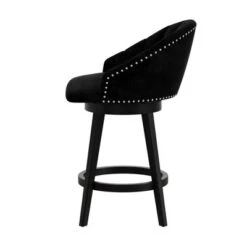 A showstopper in any room, this channel-tufted counter height stool features luxe deep black velvet fabric upholstery over plush padding while dazzling silver nail head trim adorn the scoop-back silhouette. A durable wood frame and angled legs pump up the glam factor while a 360-degree swivel mechanism serves up big comfort and high fashion. Perfect for the contemporary home, this modern counter height swivel stool adds a touch of glam and intrigue to your dining or entertaining space. Assembly required.