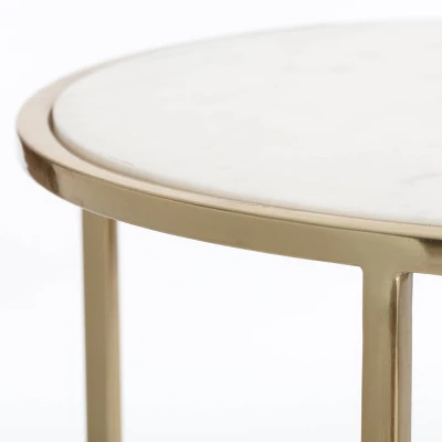 This round accent table set is the perfect answer for small living spaces. Everyone can use an extra table around the holidays or for unexpected guests, but when space is the issue, this small end table is a welcome choice. The white marble tabletop is a sure sign of excellence. The gold metal legs have a pleasing design that never goes out of style. This foolproof side table for small spaces can hold drinks for your guests and display your favorite table lamp and living room decor. This modern-looking side table has a space-saving design every homeowner will appreciate.