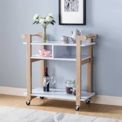 Our kitchen cart sits on four wheels for easy manuver making it easy to entertaing any guests or family. Two handles for secure control of the kart while moving around, the two divded middle shelf lets you display any plates or drink ware without them sliding side to side. The kitchen cart is made using metal hardware and composite boards to make sure it’s durable enough to handle daily use even in the long run while being sturdy enough to handle anything you can place on it.