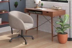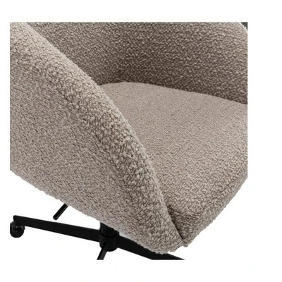 With its curvy arched backrest and smooth wrap-around arms, the Valencia Boucle Dining Chair is a home office treasure. Resembling a nearly fully formed moon, its deep seat is padded in plush high-density foam providing hours of comfort. Its soft boucle fabric upholstered seat is supported by a strong black steel base designed for everyday use. Rolling castors allow for fluid and effortless movement. Its shimmering base in an eye-catching gold finish brings forth contemporary style with a touch of neoclassical design to your home office.