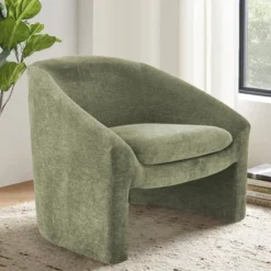 Elevate your living space with the stunning 100% fully upholstered chenille barrel accent chair. This gorgeous piece exudes modern sophistication with its sleek contours and neutral color scheme, making it the perfect statement piece for any neutral-themed decor.Complete with a round Chenille seat cushion,padded form and fully upholstered legs make it an elegant statement piece, this chair is the epitome of comfort and style. The luxurious texture of the chenille fabric adds an extra layer of coziness and warmth, making it the perfect spot to relax and unwind after a long day.Crafted with the utmost attention to detail, this chair is not only beautiful but also incredibly sturdy and durable. It comes fully assembled, so you can enjoy it right out of the box without any hassle.For a cohesive and stylish living room set, pair this accent chair with another and complement them with the loveseat couch from the same collection. The result is a modern, elegant, and inviting space that you’ll love spending time in. Don’t miss out on the opportunity to upgrade your decor with this stunning accent chair.