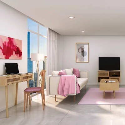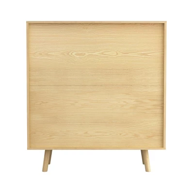 - Two rattan inlay doors with gold metal pulls and magnetic latches