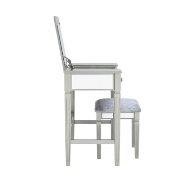 Glamorous in design and style, the Madison Vanity Set is a stylish addition to a bedroom or dressing area. The vanity features a mirrored front accented by round silver pulls. The matching stool has mirrored details and a padded silver-gray seat. Finished in an eye-catching silver, the set will add a feminine touch to any space.