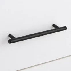 The Maylis 4-drawer Dresser gives you a sleek spot to store all your clothing items. Four spacious drawers give you plenty of space for shirts, tees, pants, socks and more. Crafted of laminated particle board and solid wood legs, the dresser is finished in mellow white, contrasted by black hardware. The top drawer is accented by round black knobs; lower drawers feature straight pull handles. Legs are angled and tapered downward, giving the dresser a mid-century modern look. Matching nightstand sold separately.