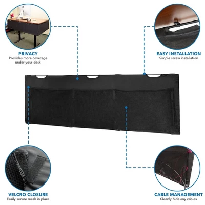 MI-7251 is a lightweight designed cover that shields the sides of your desk, giving you optimal privacy and coverage. Work with stress-free ease all day long with our modesty panel. We’ve sourced high-end fabric to create the most discrete and functional modesty panel for your desk, exuding a sleek black aesthetic that seamlessly blends into any professional office environment. Enjoy a clutter-free workspace using the built-in back panel mesh pockets to organize and store cables, office supplies, files, documents, and more! The velcro straps ensure a visual elegance that keeps everything neat and tidy.