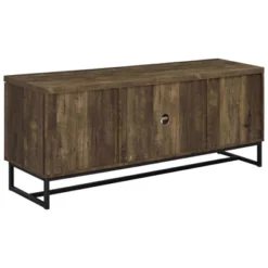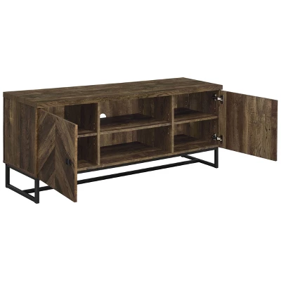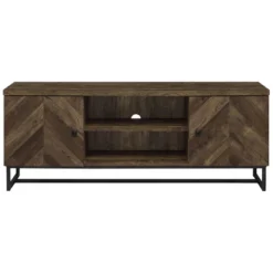 This rustic TV console offers a modern touch to a farmhouse style living room. A rustic oak finish showcases the classic herringbone pattern across the double cabinet doors. Supported on a metal trestle base in a gunmetal finish that offers an industrial flair, this TV console offers plenty of support while lifting the furniture piece over a rug and offering extra space beneath for baskets and organization. Inside each cabinet is a single adjustable shelf that may be lowered or raised as needed. In the center of this console are two open shelves for a gaming console and other entertainment systems.