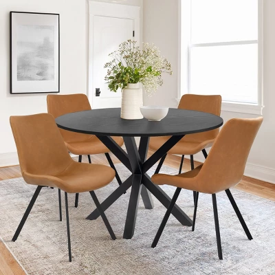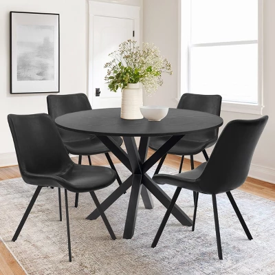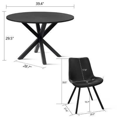 Introducing the Pop Maison shake up naturel palette with a touch of black, this dining table set exudes contemporary charm and style. The focal point of the set is the sleek Black Round Dining Table, measuring 39.4” in length and 39.4” in width. Its compact size makes it ideal for apartments, comfortably accommodating four chairs without sacrificing space.Crafted with a solid metal spray look leg, the table boasts both durability and modern aesthetics. The sturdy and weighty base provides a substantial foundation, ensuring exceptional stability for the pedestal base. The table’s surface creates a captivating floating effect, adding an element of visual intrigue to any dining area.To elevate comfort and elegance, the set includes faux leather dining chairs set of 4 that perfectly complement the table. Each chair showcases a contemporary silhouette with soft, organic edges and flared black legs, striking a balance between sophistication and comfort. The faux leather upholstery offers luxurious seating, providing a sleek and stylish look while also being easy to clean and maintain.Complete the overall look by pairing the set with a modern dining table and placing a small accent rug underneath. This thoughtful arrangement transforms any corner of your home into a stylish and inviting dining space. With the addition of the faux leather dining chairs, the set becomes a harmonious ensemble, exuding refined elegance and ensuring a memorable dining experience for you and your guests.