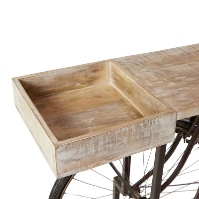 - •This rustic console table features a long wooden top with a box container and a bike-shaped leg with 2 wine bottle holders