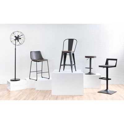 The sleek, angular construction of the Samurai Barstool is sure to make a bold statement in any living space. Lines of the rectangular-bordered backrest are echoed in the same shape of the footrest, while the combination of wood and metal contribute to an eye-catching piece. The comfy seat is perfect for long conversations, or a quick morning breakfast.