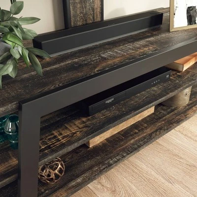 It’s time for an entertainment upgrade! Give your home the style you want with the functionality that you need with this TV stand with mount from the Steel River® collection. This industrial TV stand features a mount that accommodates up to a 50″ TV, making it ideal for catching up on episodes of your new favorite sitcom or having all-day movie marathons. The three spacious shelves provide you with a space to store your audio and video equipment. These shelves also make a great place to store and display a variety of things like decorative plants, organizing bins, and framed photos of your family. The back panel includes a pass-thru for easy cord access so you can keep all your wires neat and out of site. Finished in Carbon Oak® with a durable, black metal frame, this good looking metal and wood TV stand will give your living room the style that it deserves.