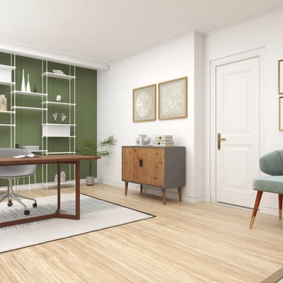 - A neutral-toned brownish gray against warm beige and light brown natural wood