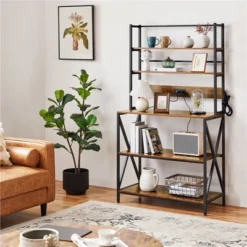 - 【Diversified Storage Space】The upper section includes one glass door cabinet and two open shelves to help you organize small spice jars or cooking gadgets. The 31.5″ L x 15″ W countertop is ideal for storing small appliances like air fryers. A roomy cupboard with an adjustable shelf below can keep kitchenware essentials corralled.