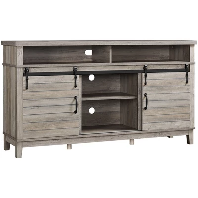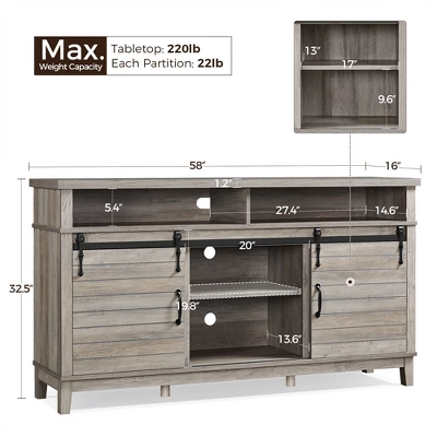 - The tabletop suits a TV up to 65 in. Behind the smooth sliding barn doors are 3 columns of 2-layer storage shelves to keep your living space organized and tidy. The shelves of the central storage area can be adjusted by changing their height or removing the partition panel altogether. When it is removed, the central shelf can accommodate an 18inch electric fireplace.In addition to protecting the stand from being damaged by dust and water, the veneer coating also makes the maintenance of this storage TV stand effortless due to how easy it is to clean. With proper maintenance, this stand can be kept as good as new for a very long time.