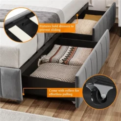 - This upholstered bed frame with Drawers would be right at home in a five-star hotel – and in your bedroom, of course. The no-fixed headboard design can customize your desirable headboard according to your style, and the frame is crafted from sturdy metal and wood slats. Available in your choice of neutral hues, this bed just might inspire you to redo the entire room around it. We love how the drawer-storage design provides a large amount of space as you organize or hide daily essentials before falling asleep. Best of all, this bed doesn’t require a box spring, so it’s ready to support your mattress right away.